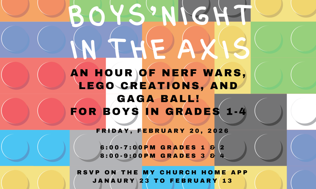 This is a fun night planned just for boys in grades 1st-4th. It will be in the AXIS from 6:00-7:00pm for Grades 1 & 2; and, 8:00-9:00pm for Grades 3 & 4. come on Friday 20th for an hour full of nerf wars, lego creations, and GaGa ball. Registration is open January 23rd-February 13th on the My Church Home app.