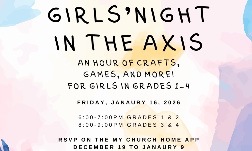 Hey girls in Grades 1-4, you won’t want to miss this special night in the AXIS on Friday January 16th. Come join us for an hour of crafts, games, snacks, and more. Be sure to register on the My Church Home app from December 19-January 9. Girls in Grades 1 & 2 will come from 6:00-7:00pm and Girls in Grades 3 & 4 will come from 8:00-9:00pm. Hope to see you there!