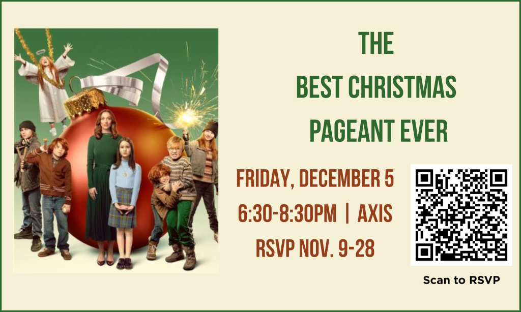 Families of all ages are invited to join us for a special evening in the AXIS from 6:30-8:30pm on Friday December 5th as we welcome in the Christmas season. We’ll be watching “The Best Christmas Pageant Ever” while enjoying popcorn & movie theater candy.. Bring your lawn chairs, blankets, sleeping bags, and even wear your PJs for a cozy Christmas night. Registration will be on the My Church Home app Nov 9-28.