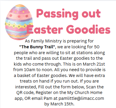 Parents/Grandparents – Join us with your little ones (birth-preK) for a time of food and fun every 2nd Monday 11:30am-1:00pm in the chapel. Our next time together is March 9. Please register on the My Church Home app or at limacommunitychurch.com by Wednesday, March 4. Hope to see you there! Click the link below to […]